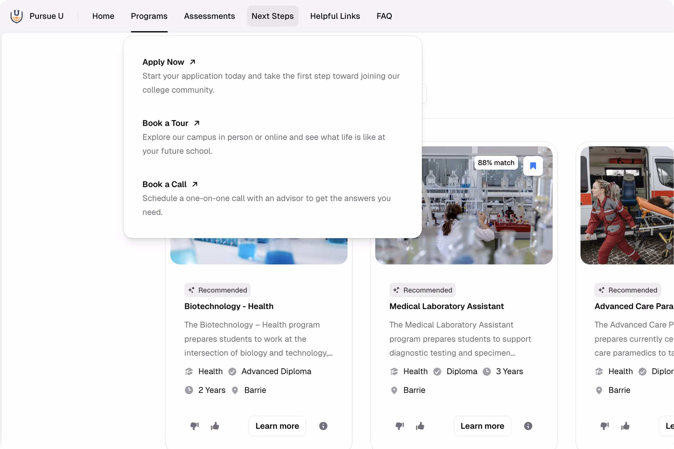 Our Next Step CTAs appear immediately after a student receives their recommendations, while interest is highest. Features include: